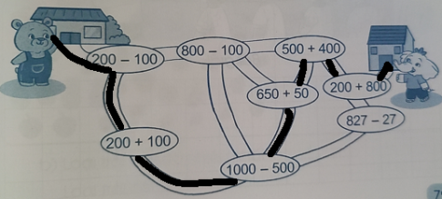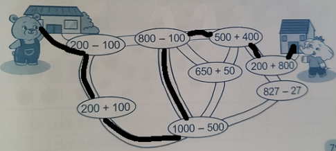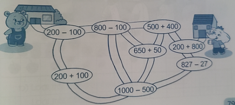Bài 3. Bạn Gấu phải đi qua các vị trí ghi phép tính có kết quả lần lượt là 100, 300, 500, 700, 900, 1000 để đến nhà bạn Voi. Hãy chỉ đường giúp bạn Gấu