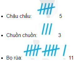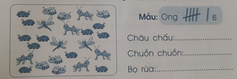Bài 2. Kiểm đếm số lượng từng loại con vật: châu chấu, chuồn chuồn, bọ rùa và ghi lại kết quả (theo mẫu):