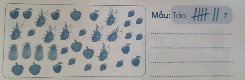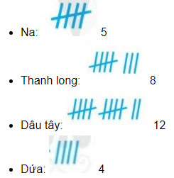 Bài 3. a) Kiểm đếm số lượng từng loại trái cây: na, thăng long, dâu tây, dứa và ghi lại kết quả (theo mẫu):