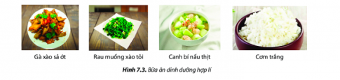 Em hãy nhận xét về loại món ăn và thành phần các nhóm được sử dụng chính trong bữa ăn hình 7.3.