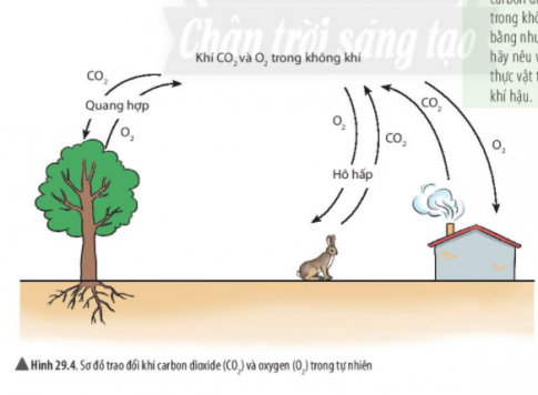- Quan sát hình 29.4, hãy cho biết hàm lượng khí carbon dioxide và oxygen trong không khí được cân bằng như thế nào? Từ đó, hãy nêu vai trò của thực vật trong điều hòa khí hậu