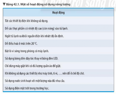 - Những hoạt động nào ở bảng 42.1 là sử dụng năng lượng hiệu quả và không hiệu quả? Vì sao?