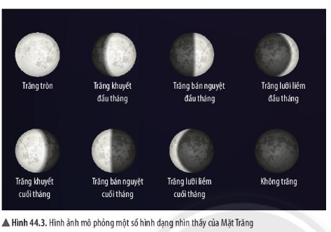 - Trong hình 44.4, em hãy chỉ ra bề mặt của Mặt Trăng được Mặt Trời chiếu sáng và phần bề mặt của Mặt Trăng mà ở Trái đất có thể nhìn thấy