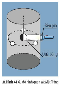 - Từ mô hình bên (hình 44.6), em hãy phát triển để có thể quan sát phần quả bóng được chiếu sáng tương ứng với các hình dạng nhìn thấy khác của Mặt Trăng