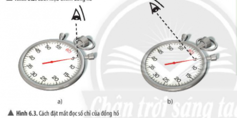 - Quan sát hình 6.3 và cho biết cách đặt mắt để đọc số chỉ của đồng hồ như thế nào là đúng?