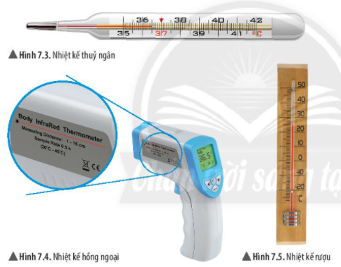 - Có các nhiệt kế như hình 7.6, để đo nhiệt độ sôi của nước trong ấm ta nên dùng loại nhiệt kế nào? Đo nhiệt độ của cơ thể ta nên dùng loại nhiệt kế nào? Vì sao?