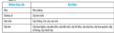 Câu 30.1. Sắp xếp các đại điện sinh vật trên vào các nhóm thực vật đã học theo mẫu sau: