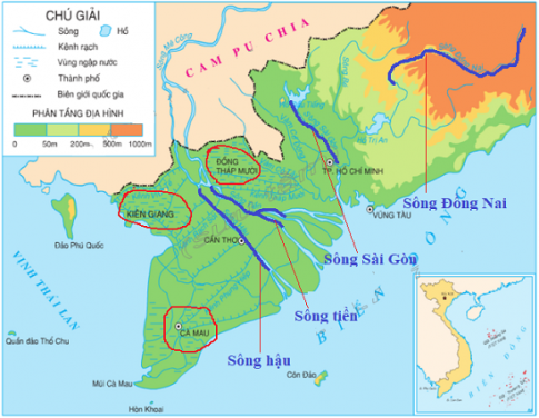 Chỉ trên bản đồ Địa lí tự nhiên Việt Nam: sông Tiền, sông Hậu, sông Đồng Nai, sông Sài Gòn và các vùng: Đồng Tháp Mười, Kiên Giang, Cà Mau.