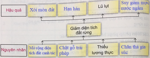 Từ các thông tin gợi ý trên hãy nêu các nguyên nhân gây suy giảm diện tích đất rừng và hậu quả của nó theo sơ đồ sau:
