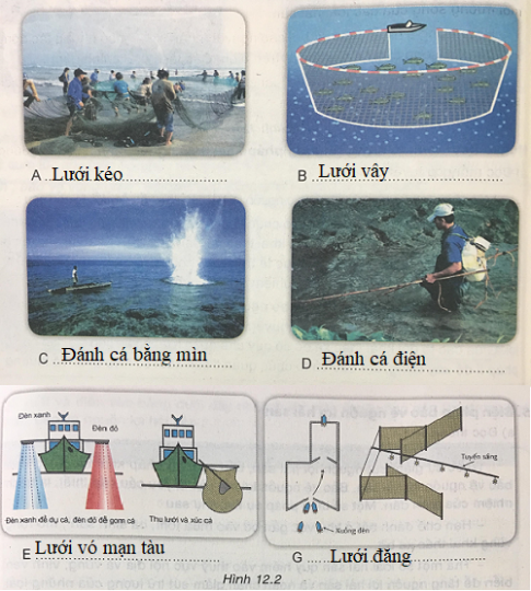 (lưới kéo, lưới vây, lưới đăng, đánh cá điện, đánh cá bằng mìn, lưới vó mạn tàu)