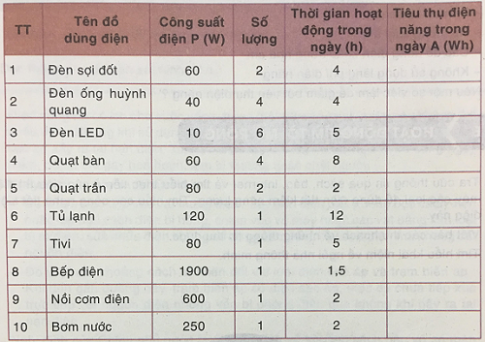 2. Tính toán điện năng tiêu thụ của các đồ dùng trong một tháng (30 ngày) trên hình 13.2 và cho biết đồ dùng nào tiêu thụ điện năng ít nhất và nhiều nhất?