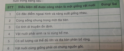 Câu 2: Chọn Đúng(Đ) hoặc Sai(S) để xác định các điều kiện công nhận giống vật nuôi trong bảng sau: