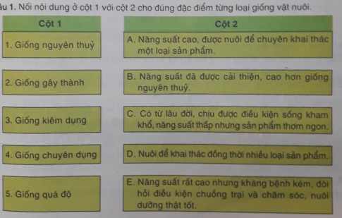Câu 1: Nối nội dung ở cột 1 với cột 2 cho đúng đặc điểm từng loại giống vật nuôi.