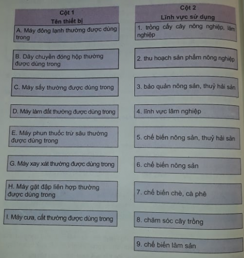 - Hãy nêu tên gọi của những máy móc và thiết bị được trình vày trong các hình ở cột 2( ví dụ tên máy ở hình B là máy cày)