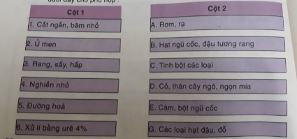 Câu 2: Ghép những phương pháp chế biến ở cột 1 với các loại thức ăn ở cột 2 trong bảng dưới đây cho phù hợp: