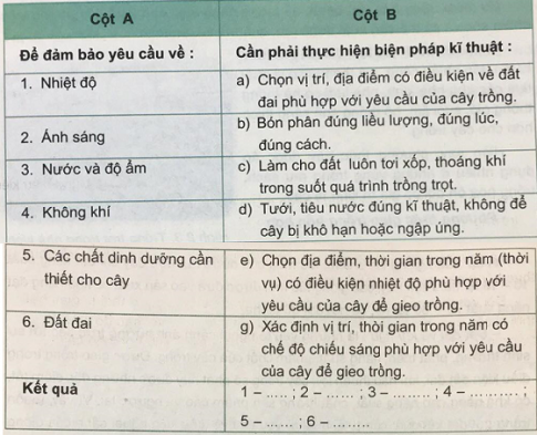 Ghép một cụm từ ở cột A với một cụm từ ở cột B để được các câu đúng về biện pháp kĩ thuật trong trồng trọt
