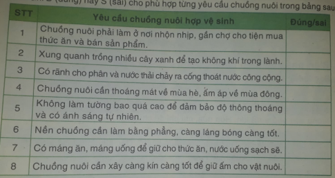 Câu 1: Ghi Đ( Đúng) hay S( Sai) cho phù hợp với yêu cầu vật nuôi trong bảng: