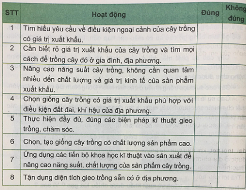 Ngoài những cây trồng có giá trị xuất khẩu được trình bày trong bài học, nước ta còn có nhiều sản phẩm cây trồng khác có giá trị xuất khẩu như hạt điều, hồ tiêu chuối, thanh long, vải thiều. .. Em hãy tìm hiểu đặc điểm sinh vật học và yêu cầu về điều kiện ngoại cảnh của một loại cây trồng có giá trị xuất khẩu bằng cách đọc tài liệu hoặc tra cứu trên mạng internet với từ khoá là tên cây trồng định tìm hiểu hoặc “ Cây trồng có giá trị xuất khẩu ở Việt Nam ”. Sau đó, tìm hiểu các điều kiện về đất đai, thời tiết, khí hậu của địa phương để xác định xem loại cây trồng đó có thể trồng được ở địa phương em hay không và muốn gieo trồng đạt kết quả thì cần phải làm như thế nào, Ghi vào vở những thông tin em thu thập được để trình bày. Kết thúc cuộc trò chuyện Nhập tin nhắn...