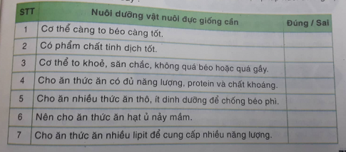 Câu 2: Chọn đúng (Đ) hay sai(S) trong những yêu cầu và bện pháp nuôi dưỡng vật nuôi giống đực sau đây: