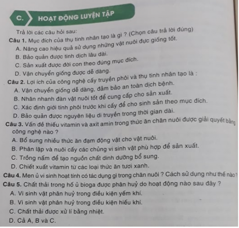 Câu 1: Công nghệ nào được ứng dụng để nâng cao năng suất sinh sản của vật nuôi? (Chọn câu trả lời đúng):