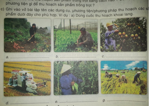 c. Ghi vào vở bài tập lên các dụng cụ: phương tiện/phương pháp thu hoạch các sản phẩm dưới đây cho phù hơp