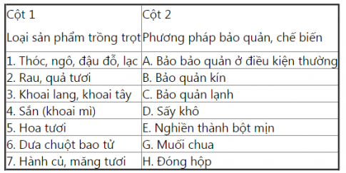 2. Nối các ý ở cột 1 với cột 2 cho phù hợp về sản phẩm trồng trọt và phương pháp bảo quản, chế biến tương ứng