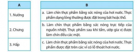 Câu 21. Nối tên các phương pháp chế biến thực phẩm ở cột A với những mô tả ở cột B cho phù hợp.