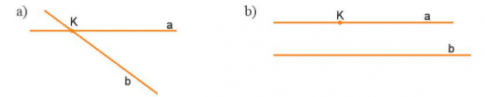 b) Điểm K thuộc đường thẳng a nhưng không thuộc đường thẳng b