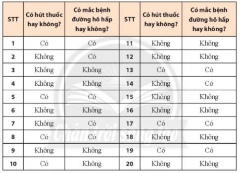 Bài 10. Thái thực hiện một điều tra về mối liên quan giữa thuốc lá và bệnh đường hô hấp. Em hỏi ngẫu nhiên 20 nam giới ở độ tuổi từ 40 đến 50 và được bảng kết quả như sau: