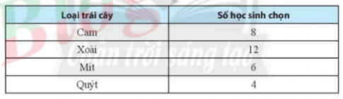 Bài 1. Biểu đồ sau đây cho biết thông tin về loại trái cây yêu thích của các bạn học sinh lớp 6B. Em hãy ghi các dữ liệu học được từ biểu đồ vào bảng thống kê tương ứng