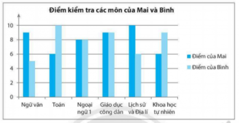 Bài 4. Đọc biểu đồ cột kép biểu diễn điểm kiểm tra các môn của hai bạn Mai và Bình sau đây và nêu nhận xét của em.
