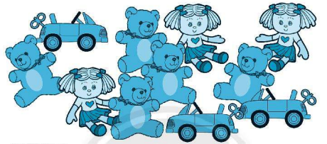 Có 3 xe ô tô. Có 5 gấu bông. Có 3 búp bê