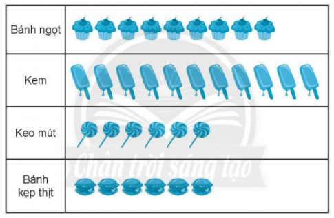 Số bánh ngọt ít hơn số kem nhưng nhiều hơn số kẹo mút
