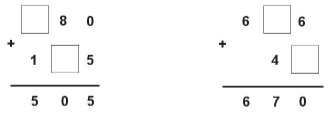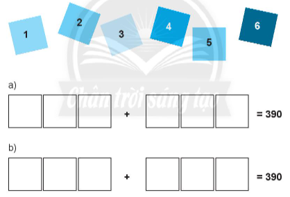 Đặt các tấm bìa ghi chữ số vào các ô vuông để có hai phép tính cộng khác nhau (mỗi tấm bìa chỉ đặt một lần)