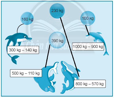 Bài 2. Tính rồi nối để biết khối lượng của mỗi chú cá heo (theo mẫu)