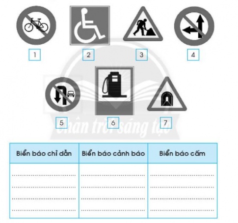 Câu 1. Xếp các biển báo giao thông dưới đây vào cột phù hợp và viết tên gọi của biển báo đó theo bảng bên dưới.