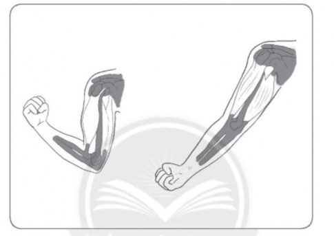 Câu 4. Tô màu đỏ cho các cơ có trong hình sau. Khi chúng ta co và duỗi tay, cơ thay đổi như thế nào? Viết vào chỗ (...) câu trả lời của em.