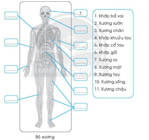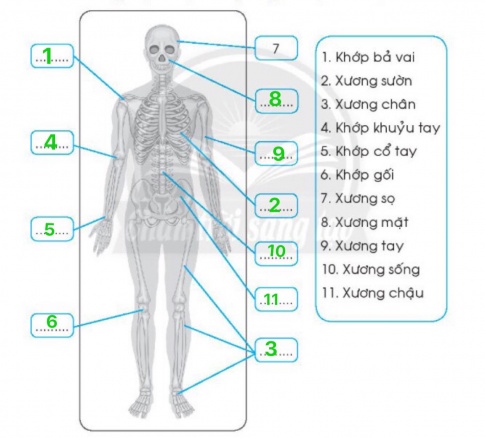 Câu 1. Điền số vào chỗ (...) sao cho tên gọi phù hợp với vị trí của mỗi xương hoặc khớp xương trong hình (theo mẫu).