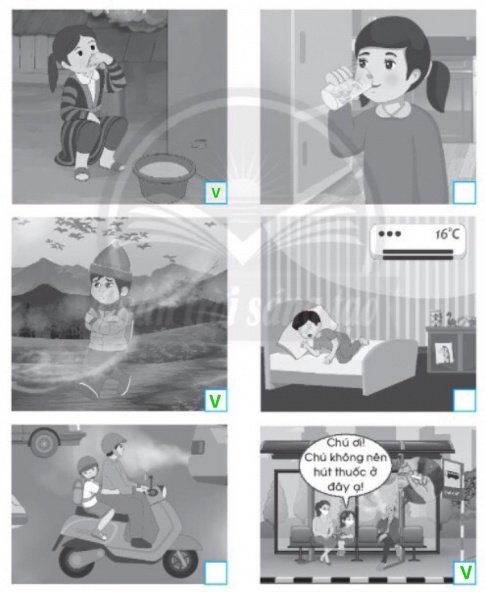 Câu 1. Đánh dấu V vào ô trống ở hình chỉ việc em nên làm để bảo vệ cơ quan hô hấp.