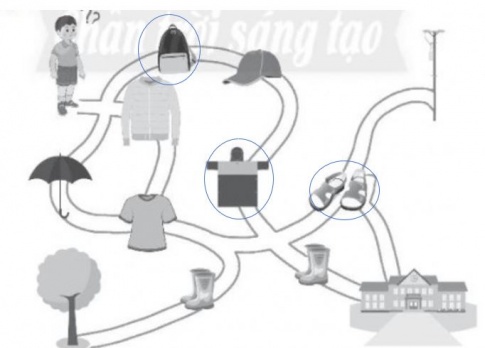 Câu 4. Nơi bạn Tú ở đang là mùa mưa. Tô màu tìm đường đi giúp Tú đến trường dựa theo những trang phục cần thiết mà Tú phải mang theo.