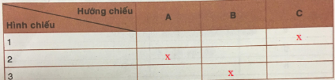 1. Đánh dấu x vào bảng 3.2 để chỉ rõ sự tương quan giữa các hướng chiếu với hình chiếu trong hình 3.12a, b