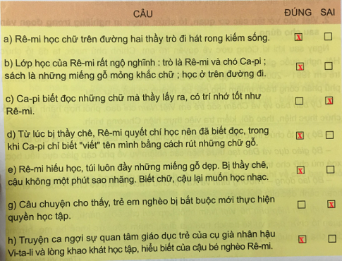 Đánh dấu X vào ô thích hợp: