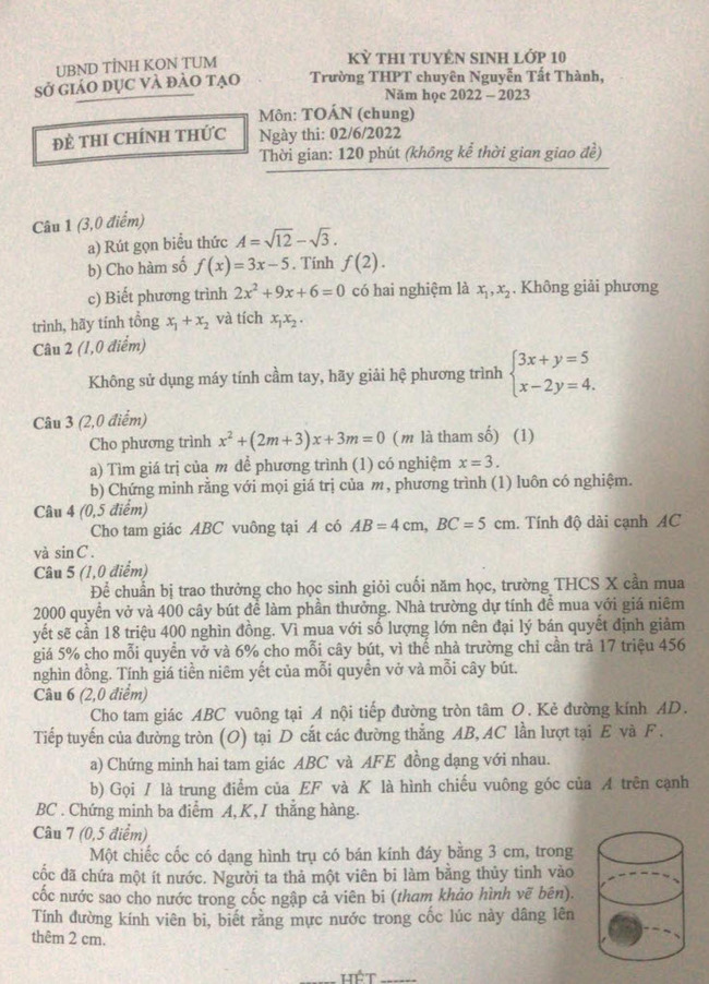 Đáp án đề thi vào lớp 10 môn Toán chuyên Nguyễn Tất Thành, Kon Tum năm 2022 Đề thi môn Toán lớp 10 chuyên Nguyễn Tất Thành năm 2022