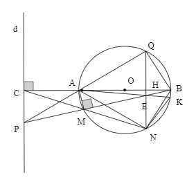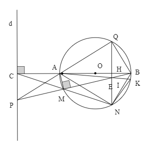 . Tia BM cắt đường thẳng d tại điểm P. Tia CM cắt đường tròn (O) tại điểm thứ hai là N, tia PA cắt đường tròn (O) tại điểm thứ hai là Q.