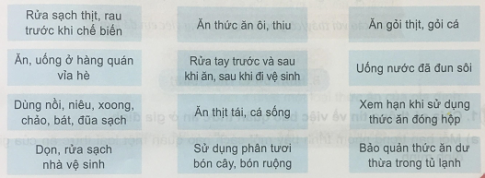 Rửa sạch thịt, rau trước khi chế biến Dùng nồi, niêu, xong, chảo, bát đũa sạch Dọn rửa sạch nhà vệ sinh Rửa tay sạch trước khi ăn, sau khi đi vệ sinh Uống nước đã đun sôi Xem hạn sử dụng thức ăn đóng hộp Bảo quản thức ăn dư thừa trong tủ lạnh | Ăn uống ở hàng quán vỉa hè Ăn thức ăn ôi, thiu Ăn thịt tái, cá sống Sử dụng phân tươi bón cây, bón ruộng Ăn gỏi thịt, gỏi cá |