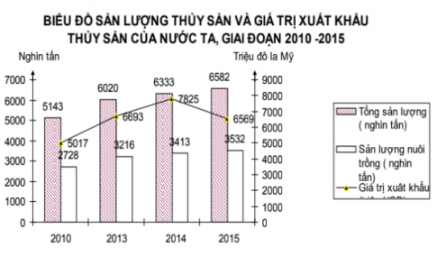 Căn cứ vào biểu đồ, cho biết nhận xét nào sau đây không đúng về sự thay đổi sản lượng thủy sản và giá trị xuất khẩu thủy sản của nước ta, giai đoạn 2010 - 2015?