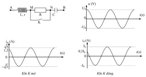 Câu 36: Đặt vào hai đầu đoạn mạch AB một điện áp xoay chiều có đồ thị điện áp tức thời phụ thuộc vào thời gian như hình vẽ. Trong đó điện áp cực đại U0 và chu kì dòng điện không thay đổi. Khi đóng và mở khóa K thì cường độ dòng điện tức thời trong mạch phụ thuộc vào thời gian như hình vẽ. Giá trị của I0 là