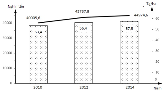 Qua biểu đồ về năng suất và sản lượng lúa nước ta giai đoạn 2010-2014 ở trên. Để đọc và hiểu biều đồ cần phải bổ sung nội dung nào sau đây?