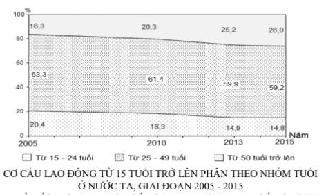 Căn cứ vào biểu đồ, cho biết nhận xét nào sau đây không đúng về sự thay đổi tỉ trọng trong cơ cấu lao động từ 15 tuổi trở lên phân theo nhóm tuổi ở nước ta, giai đoạn 2005 - 2015?