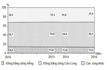 Theo biểu đồ, nhận xét nào sau đây đúng về sự thay đổi tỉ trọng trong cơ cấu diện tích lúa phân theo vùng của nước ta, giai đoạn 2010 - 2016?